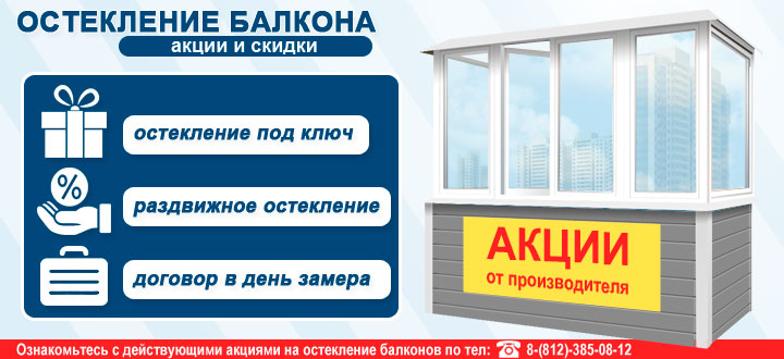 Выбор конструкции для обустройства балкона является основным этапом на пути к комфорту в помещении. Разнообразие системы остекления предоставляет возможность получить необходимые параметры изделия без дополнительных вложений. Остекление балконов и лоджий по акции существенно снижает стоимость производства конструкций, а так же позволяет сэкономить на установке готовых изделий. При бюджетном остеклении по СПб качество оконного профиля и сроки выполнения работ остаются на высоком уровне, цена изменяется за счет взаимовыгодных предложений, которые может предоставить только производитель.